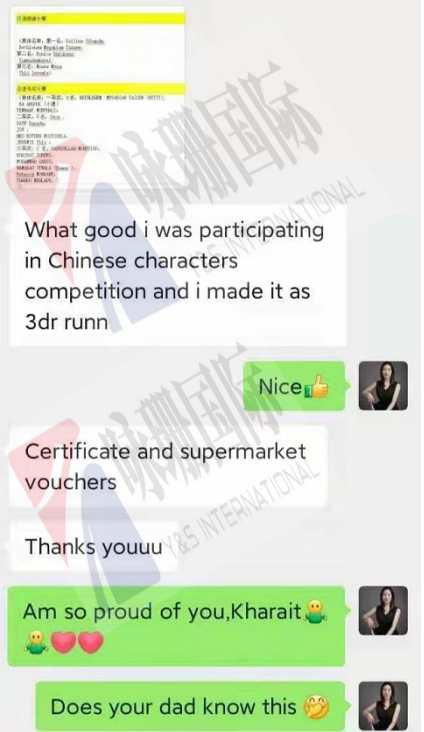 Good News from Yongshan International StudentsIssuing time:2021-02-24 21:35 Good News from Yongshan International Students This morning received good news from Tanzanian Student Kharait: She won the third place in the Chinese writing competition held by her school.